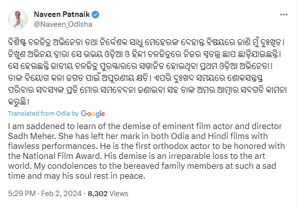 Actor Sadhu Mehar Passes Away : राज्य के मुख्यमंत्री नवीन पटनायक ने मेहर के निधन पर शोक जताते हुए कहा कि उन्होंने हिंदी और उड़िया दोनों ही भाषाओं की फिल्मों में अपने बेहतरीन अभिनय से विशेष छाप छोड़ी है। नवीन पटनायक ने कहा, ‘‘ साधु मेहर राष्ट्रीय फिल्म पुरस्कार से सम्मानित होने वाले पहले उड़िया अभिनेता हैं। उनका जाना कला जगत के लिए अपूरणीय क्षति है।’’