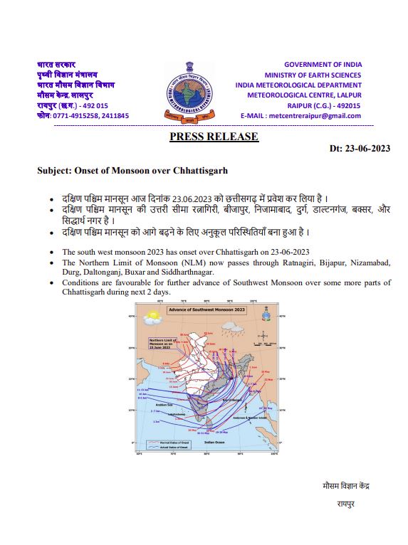 Entry of monsoon in Chhattisgarh: रायपुर। छत्तीसगढ़ में मानसून की एंट्री हो गई है, मौसम विभाग ने इसकी आधिकारिक जानकारी दे दी है। राजधानी रायपुर के लालपुर स्थित मौसम विभाग ने बताया है कि दक्षिण पश्चिम मानसून आज दिनांक 23.06.2023 को छत्तीसगढ़ में प्रवेश कर लिया है। दक्षिण पश्चिम मानसून की उत्तरी सीमा रत्नागिरी, बीजापुर, निजामाबाद, दुर्ग, डाल्टनगंज, बक्सर और सिद्धार्थनगर है। दक्षिण पश्चिम मानसून को आगे बढ़ने के लिए अनुकूल परिस्थितियां बनी हुई हैं।