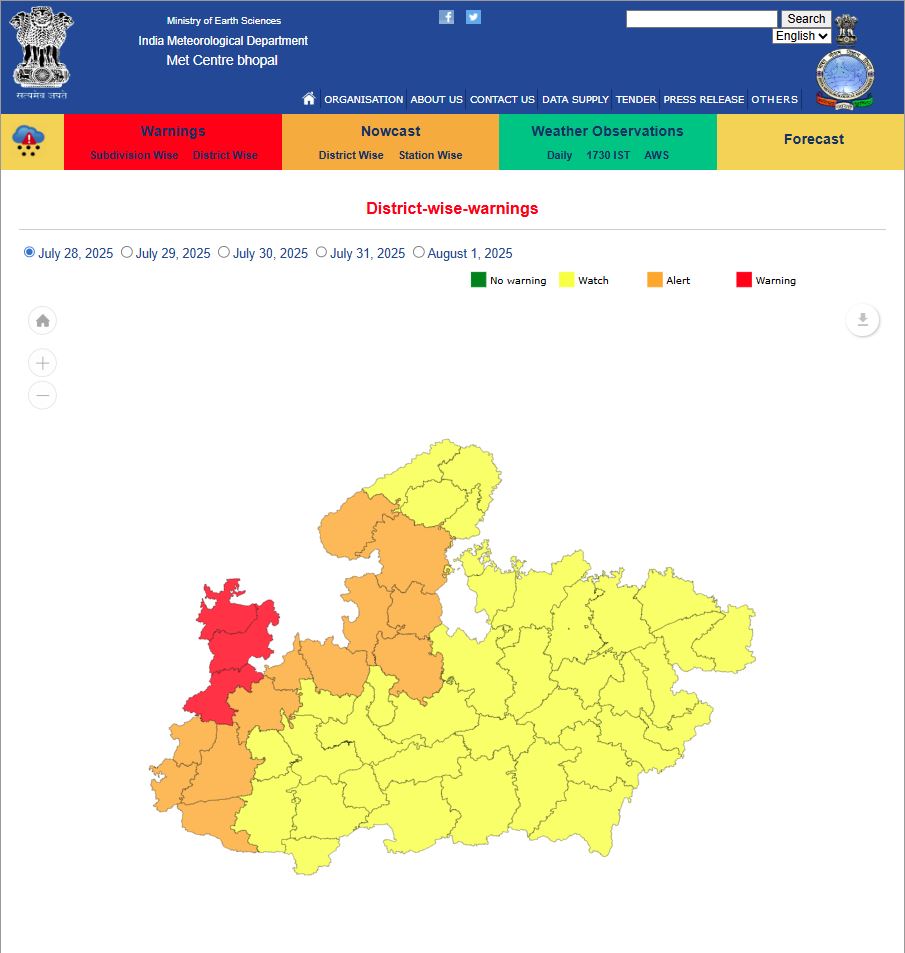- रतलाम, मंदसौर, नीमच में रेड अलर्ट जारी।