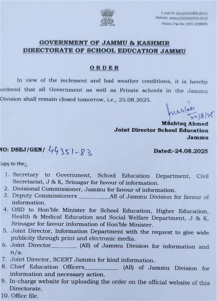 j&k School Closed , डायरेक्टोरेट ऑफ स्कूल एजुकेशन जम्मू (DSEJ) ने यह निर्णय एहतियात के तौर पर लिया है ताकि छात्रों, शिक्षकों और अभिभावकों की सुरक्षा सुनिश्चित की जा सके। डीएसईजे की ओर से जारी आधिकारिक आदेश में कहा गया है कि भारी वर्षा के कारण 25 अगस्त 2025 को सभी सरकारी और निजी स्कूलों को बंद रखा जाएगा।