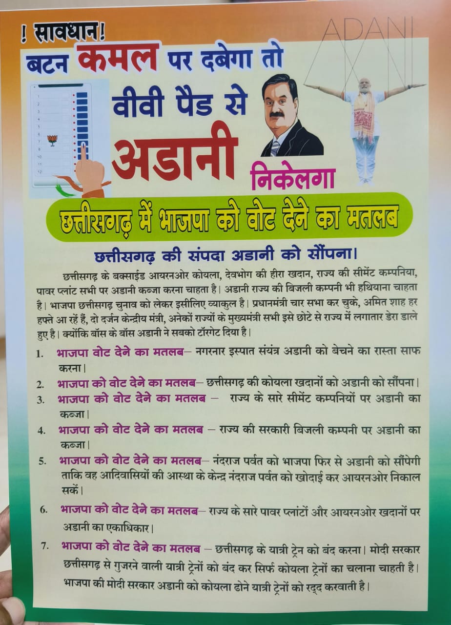 कांग्रेस ने यह पोस्टर चुनाव में भाजपा के खिलाफ तैयार कराया है। इसके जरिये कांग्रेस ने छग भाजपा समेत सीधे केंद्र की सरकार को निशाने पर लेने की कोशिश की है। पोस्टर में कांग्रेस ने कारोबारी अडानी के नाम और फोटो का भी इस्तेमाल किया है और लिखा है ‘कमल पर बटन दबेगा तो वीवीपैट से अडानी निकलेगा।