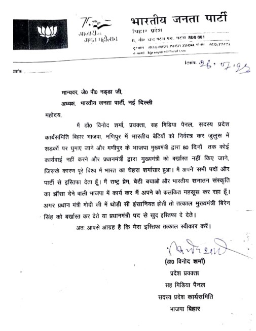 BJP famous spokesperson resigned पटना। मणिपुर पर संसद में जारी महासंग्राम के बीच बिहार में बीजेपी को बड़ा झटका लगा है, बीजेपी के प्रदेश प्रवक्ता विनोद शर्मा ने पार्टी से इस्तीफा दे दिया है, उन्होंने इस इस्तीफे के पीछे मणिपुर में जारी हिंसा को वजह बताया है। विनोद शर्मा ने अपना इस्तीफा बीजेपी के राष्ट्रीय अध्यक्ष जेपी नड्डा को भेज दिया है।