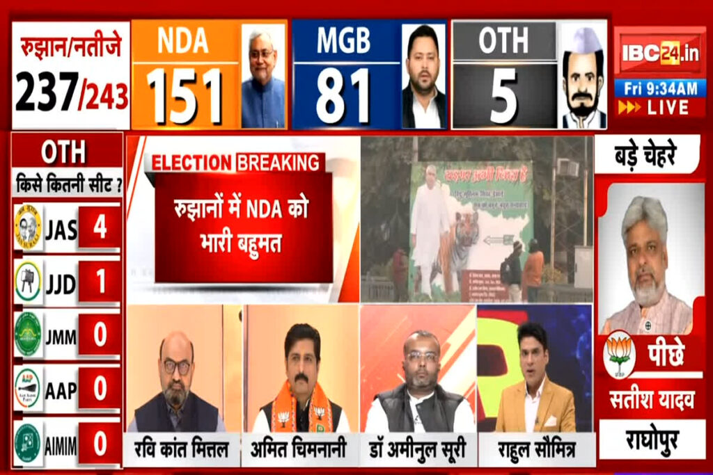 इस बीच बड़ी खबर यह आयी है कि शुरुवाती रुझानों में सम्राट चौधरी और तेज़ प्रताप यादव दोनों पीछे चल रहे हैं। वहीं राघोपुर से तेजस्वी यादव और अलीनगर से मैथिली ठाकुर आगे हैं। छपरा से खेसारी लाल आगे चल रहे हैं। अब तक सभी सीटों के रुझान सामने आ चुके हैं।