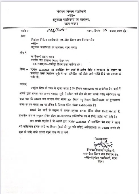पटनाः Bihar Politics: बिहार विधानसभा चुनाव नजदीक आने के साथ ही सूबे का सियासी पारा आसमान छूने लगा है। नेताओं के बीच सियासी बयानबाजी तो जारी ही है, साथ ही साथ अब कई नेता चुनाव आयोग तक पर सवाल उठा रहे हैं। चुनाव के पहले वोटर लिस्ट के पुनर्रीक्षण के बाद पहल ड्राफ्ट आया तो आरजेडी नेता और विधानसभा में नेता विपक्ष तेजस्वी यादव ने चुनाव आयोग पर वोटर लिस्ट में अपना नाम न होने का मुद्दा उठाया जबकि बाद में सामने आया कि उनके पास दो दो वोटर आईडी है। अब इस मामले को लेकर चुनाव आयोग ने तेजस्वी यादव को नोटिस भेजा है।