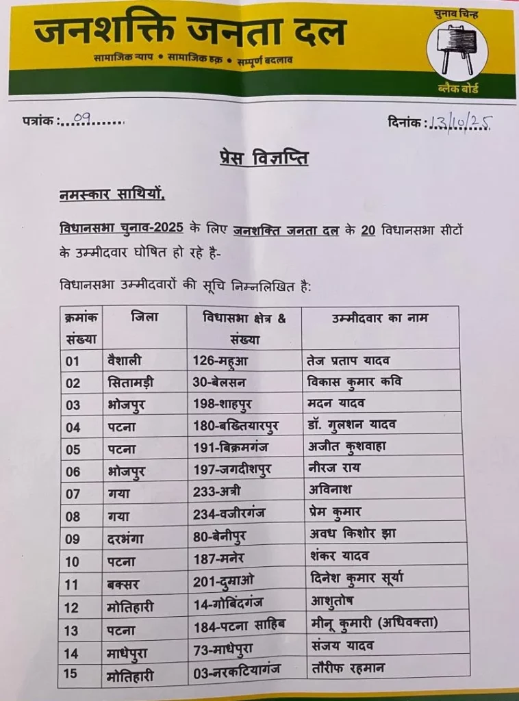 Bihar Election 2025: लालू यादव के बड़े बेटे की पार्टी ने जारी की पहली लिस्ट! तेज प्रताप यादव इस सीट से लड़ेंगे चुनाव, तेजस्वी को देंगे सीधी टक्कर, देखें 21 उम्मीदवारों की सूची