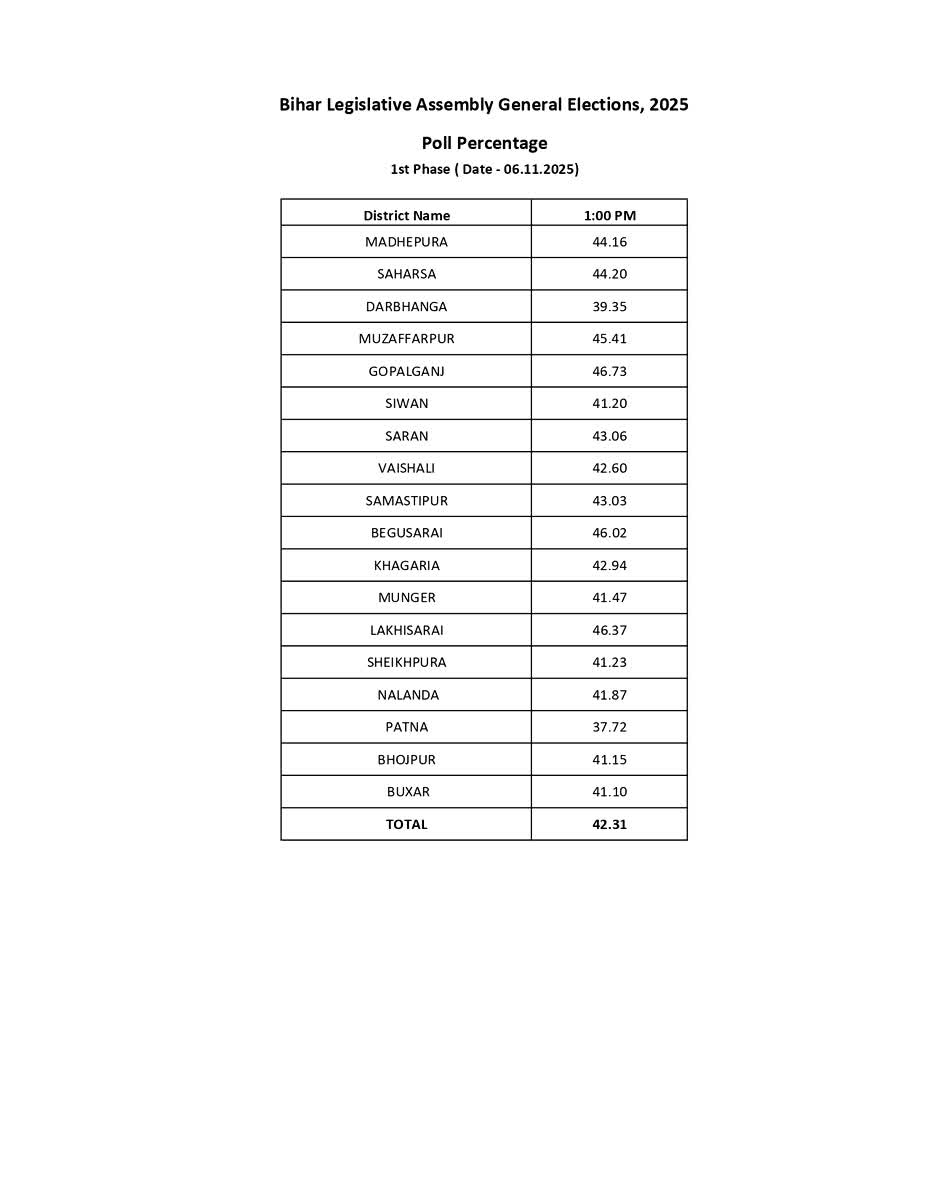 सुबह 9 बजे तक 13.13% मतदान दर्ज किया गया था, जो दोपहर 1 बजे तक बढ़कर लगभग 42.31% हो गया। इस चरण में राज्य के 18 जिलों की 121 विधानसभा सीटों पर जनता अपने मताधिकार का प्रयोग कर रही है।