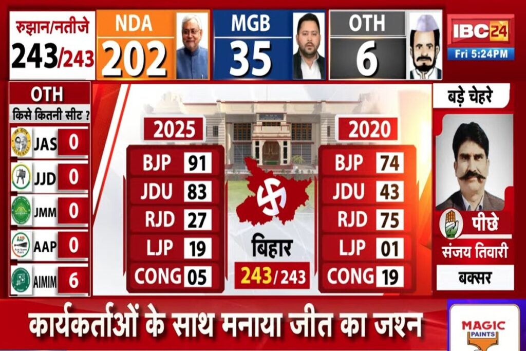 Bihar Chunav Result 2025 वहीं किशनगंज के अलावा कांग्रेस मनिहारी सीट पर लीड कर रही है, यहां से पार्टी प्रत्याशी मनोहर प्रसाद सिंह लगभग तीन हजार वोटों से आगे चल रहे हैं। साथ ही वाल्मिकीनगर में सुरेंद्र प्रसाद, चनपटिया में अभिषेक रंजन और अररिया से अब्दुल रहमान आगे चल रहे हैं।