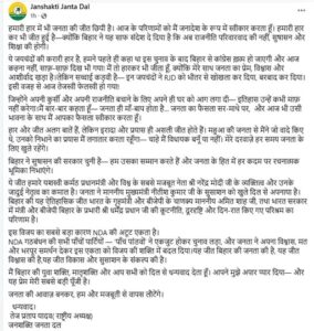 Bihar Election Result 2025 पटना: बिहार चुनाव के नतीजे साफ होने लगे हैं। NDA 202 और महागठबंधन 35 सीटों पर आगे है। इस चुनाव महागठबंधन को तगड़ा नुकसान हो रहा है। प्रदेश में कांग्रेस की हालात बेहद बुरी है। तेजप्रताप यादव महुआ से चुनाव हार गए हैं। उनकी पार्टी JJD ने हार के बाद फेसबुक पर पोस्ट किया है। इसमें लिखा है- तेजस्वी फेलस्वी हो गया। RJD को जयचंदों ने खोखला कर दिया। मोदी विश्व के मजबूत नेता हैं। NDA को उसकी एकता ने जिताया।