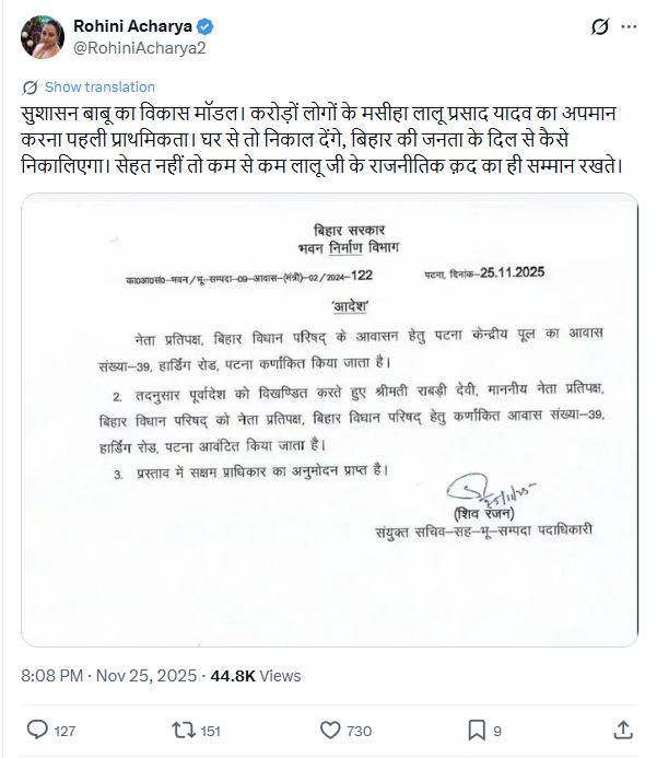 Rabri Devi New Residence Allotted: सरकार के इस आदेश पर राबड़ी देवी की बेटी रोहिणी आचार्य ने सोशल मीडिया पर तीखी प्रतिक्रिया दी है। रोहिणी ने लिखा "सुशासन बाबू का विकास मॉडल। करोड़ों लोगों के मसीहा लालू प्रसाद यादव का अपमान करना पहली प्राथमिकता।