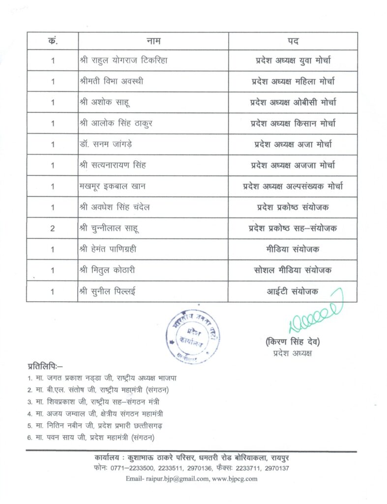रायपुर: छत्तीसगढ़ भाजपा ने अपने नए पदाधिकारियों के नाम का ऐलान कर दिया है। प्रदेश अध्यक्ष किरण सिंहदेव ने इस संबंध में सूची जारी कर दी है। आप भी देखें किस नेता को प्रदेश संगठन में कौन सी जिम्मेदारी दी गई है।