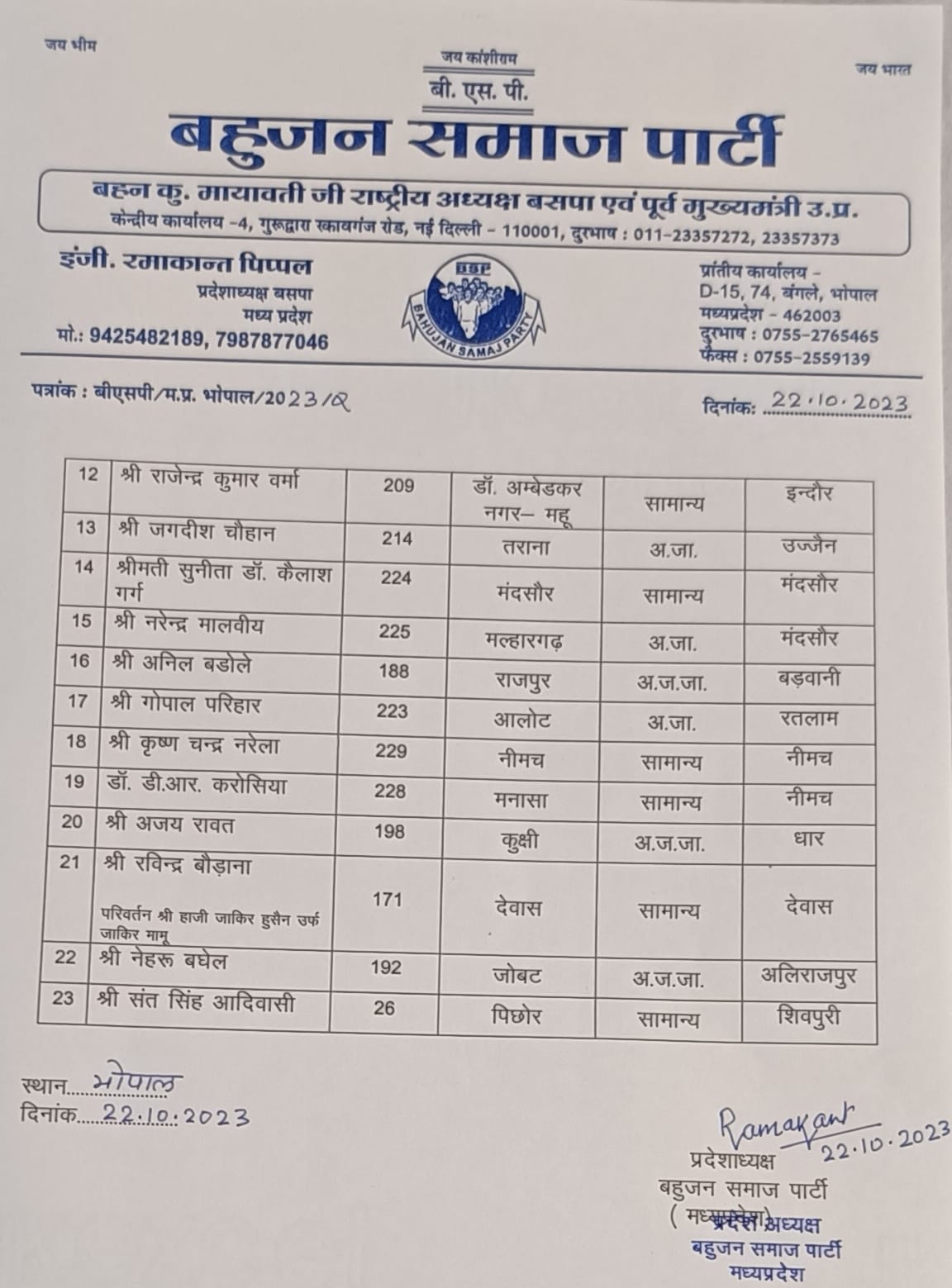 MP BSP Candidate List 2023 : बसपा ने जारी की अपनी 10वीं सूची, 23 प्रत्याशियों के नाम पर लगाई मुहर