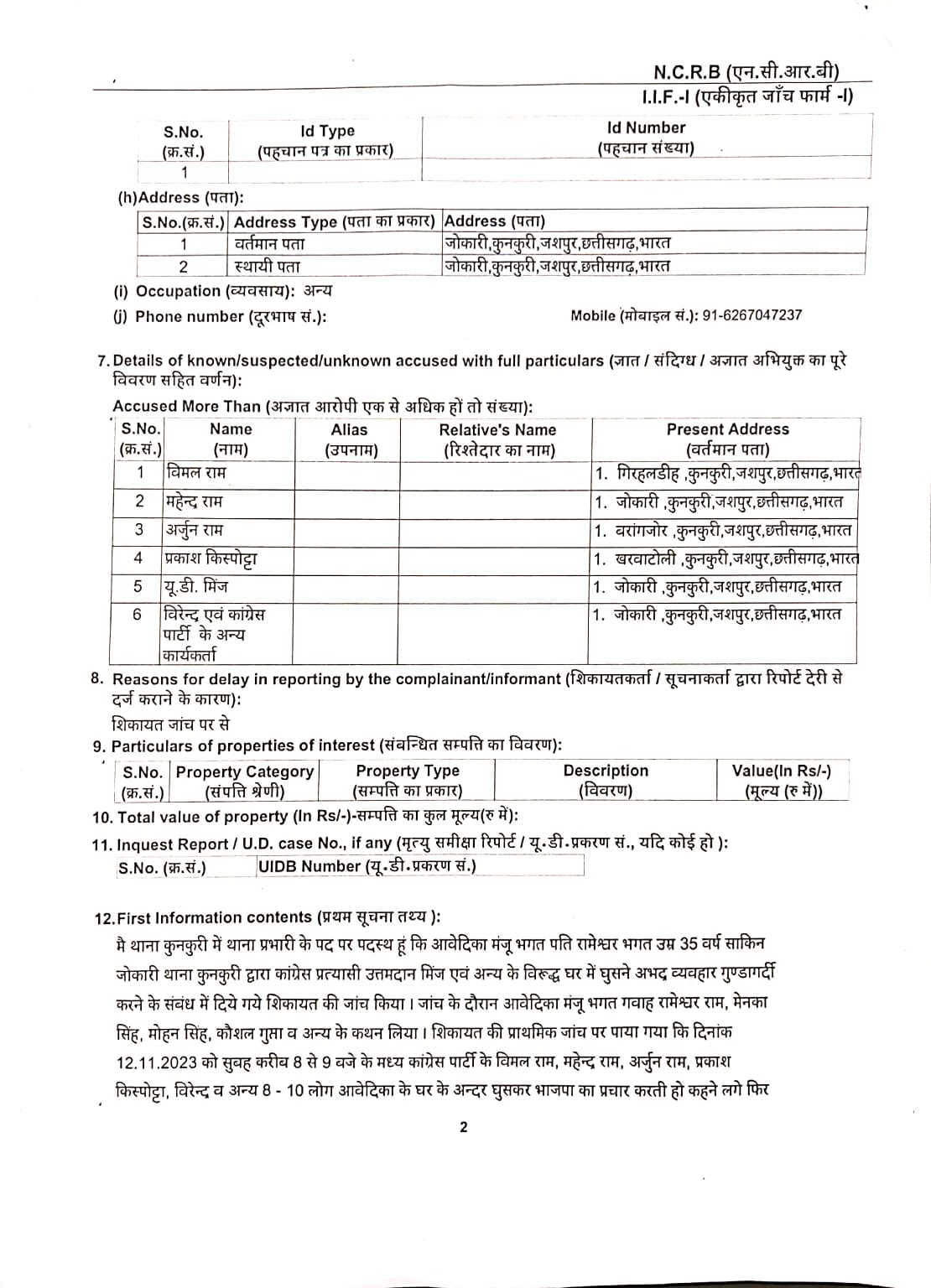 वहीं इस मामले में भाजपा प्रत्याशी विष्णुदेव साय भाजपा कार्यकर्ताओं के साथ कुनकुरी थाने के सामने हजारों की संख्या में बैठकर कार्यवाही की मांग कर रहे थे। फिलहाल कुनकुरी पुलिस ने इस मामले पर कार्यवाही करते हुए दोषियों के विरुद्ध अपराध पंजीबद्ध किया है। वहीं रिटर्निंग ऑफिसर के शिकायत पर प्रदर्शन कर रहे भाजपाइयों के विरुद्ध भी आचार संहिता उल्लंघन का मामला पुलिस ने दर्ज किया है।