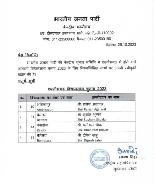 CG BJP Candidate last list रायपुर। छत्तीसगढ़ में बीजेपी ने विधानसभा चुनाव के लिए अपने आखिरी शेष चार उम्मीदवारों के नाम का ऐलान कर दिया है। इस सूची में बीजेपी ने अंबिकापुर से राजेश अग्रवाल को, बेलतरा से सुशांत शुक्ला, कसडोल से धनीराम धीवर, बेमेतरा से दीपेश साहू को टिकट दिया गया है। बता दें कि अंबिकापुर से कांग्रेस से टीएस सिंहदेव उपमुख्यमंत्री चुनाव लड़ रहे हैं, पिछली बार उनके खिलाफ भाजपा ने अनुराग सिंहदेव को टिकट दिया था।