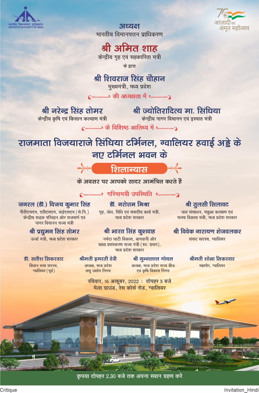 Home Minister Amit Shah will be on Gwalior tour आपको बता दें कि ग्वालियर के राजमाता विजयाराजे सिंधिया एयर टर्मिनल के विस्तार का शिलान्यास 16 अक्टूबर को होगा। शिलान्यास कार्यक्रम में केंद्रीय गृहमंत्री अमित शाह मुख्य अतिथि होंगे। शाह ग्वालियर एयरपोर्ट पर 16 अक्टूबर को दोपहर 3 बजे उतरेंगे। इसके बाद सीधे भूमिपूजन स्थल पर जाएंगे।