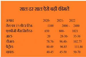 खाने के तेल के दाम सबसे ज्यादा बढ़े हैं। शुरू में यह दाम अस्थायी रूप से बढ़े थे, लेकिन बाद में यह बढ़े हुए दाम पर स्थिर हो गए हैं। जो खनिज तेल साल 2020 में फरवरी के महीने तक 1100 रुपए में 15 लीटर मिल रहा था, वही कोरोना के दौरान 1200 तक पहुंचा और लॉकडाउन खुलने के बाद 1500 पर जा पहुंचा। लेकिन यह यहीं नहीं थमा। शुरू में कोरोना की आड़ लेकर बढ़ा फिर इसने पीछे मुड़कर नहीं देखा। 2021 दिसंबर तक इसकी कीमतें 2000 रुपए को पार कर गईं, जबकि अभी साल 2022 में अप्रैल की कीमतें 2400 के ऊपर चल रही हैं। तेल में 150 फीसद तक की वृद्धि हुई है।