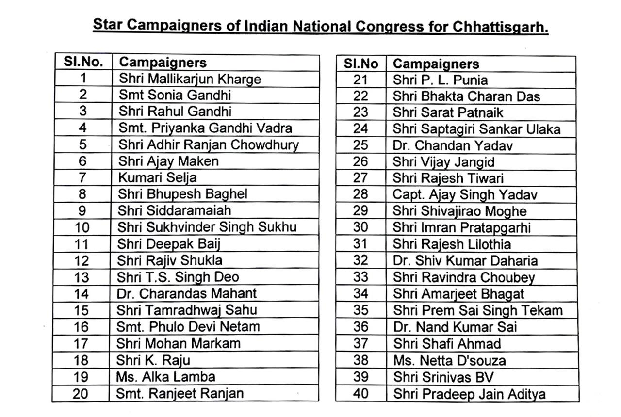 सूची में अन्य नामों की बात करें तो अधीर रंजन चौधरी, अजय माकन, कुमारी शैलजा के नाम भी शामिल हैं। वही के.राजू, अलका लांबा, रंजीत रंजन, pl पुनिया, भक्त चरण दास, सरत पटनायक, सप्त गिरी शंकर उल्का, डॉक्टर चंदन यादव, विजय जैन, राजेश तिवारी, कैप्टन अजय सिंह यादव, शिवाजी राव, इमरान प्रतापगढ़ी, राजेश लिलोटिया, मंत्री शिवकुमार डहरिया, रविंद्र चौबे, अमरजीत भगत, प्रेमसाय सिंह टेकाम, सफी अहमद, नेट्टा डिसूजा, श्रीनिवास बीवी, नंद कुमार साय, प्रदीप जैन आदित्य के नाम शामिल हैं।