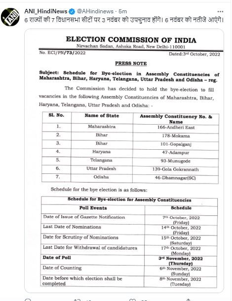 6 राज्यों की 7 विधानसभा सीटों पर उपचुनाव के लिए आचार संहिता लागू, 6 नवंबर को आएंगे नतीजे, यहां पर देखें पूरा शेड्यूल