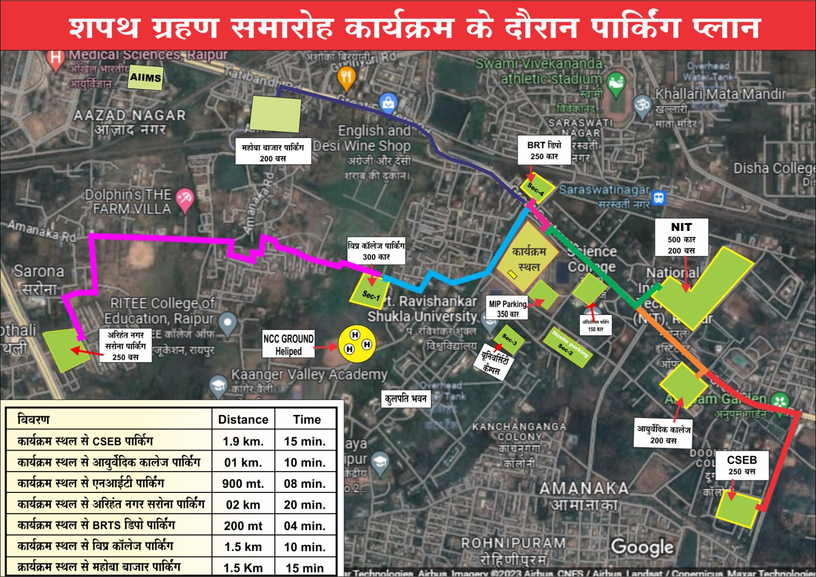 VVIP PARKING(सेक्टर 01 एवं सेक्टर 04):- कार्यक्रम में सम्मिलित होने वाले VVIP जिन्हे सेक्टर 01 एवं सेक्टर 04 पास जारी हुआ है वे टाटीबंध चौक से जी.ई रोड होकर बस डिपो पार्किंग सेक्टर-04 एवं यूनिवर्सिटी मेन गेट से प्रवेश कर विप्र कालेज पार्किंग सेक्टर-01 में अपना वाहन पार्क करेंगे।
