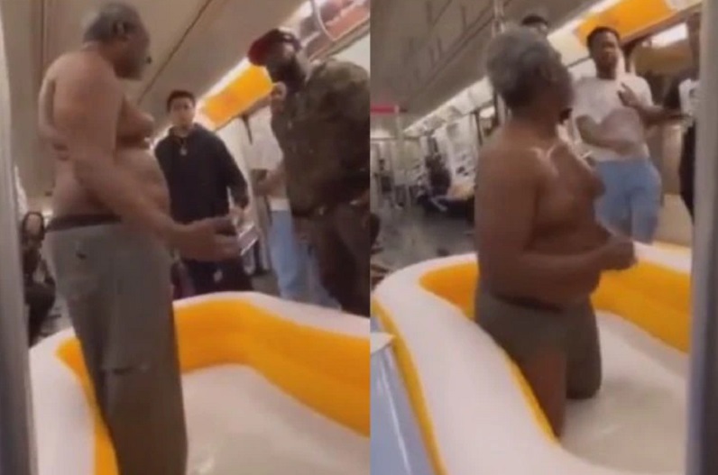 ये वीडियो न्यूयॉर्क सिटी का है। इसमें स्पष्ट तौर पर देखा सकता हैं कि चलती ट्रेन में व्यक्ति बाथ टब में नहा रहा है। शख्स एक बोतल से अपने उपर पानी डाल रहा है। उसकी इस हरकत से मेट्रो में यात्रा कर रहे यात्रियों को काफी दिक्कत हो रही है। जब बाकि लोगों ने उसके इस बात से नाराजगी जताई तो वह मारपीट पर उतर आया। धक्का मुक्की के बाद शख्स मारपीट करने लगा।