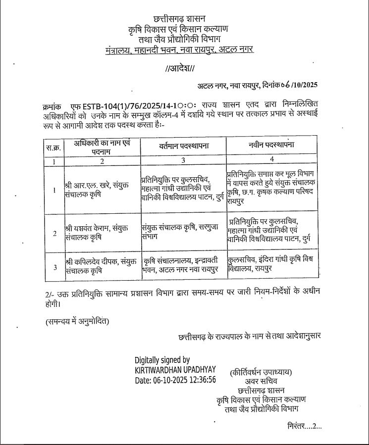 - छत्तीसगढ़ कृषि विभाग में तीन अफसरों के तबादले