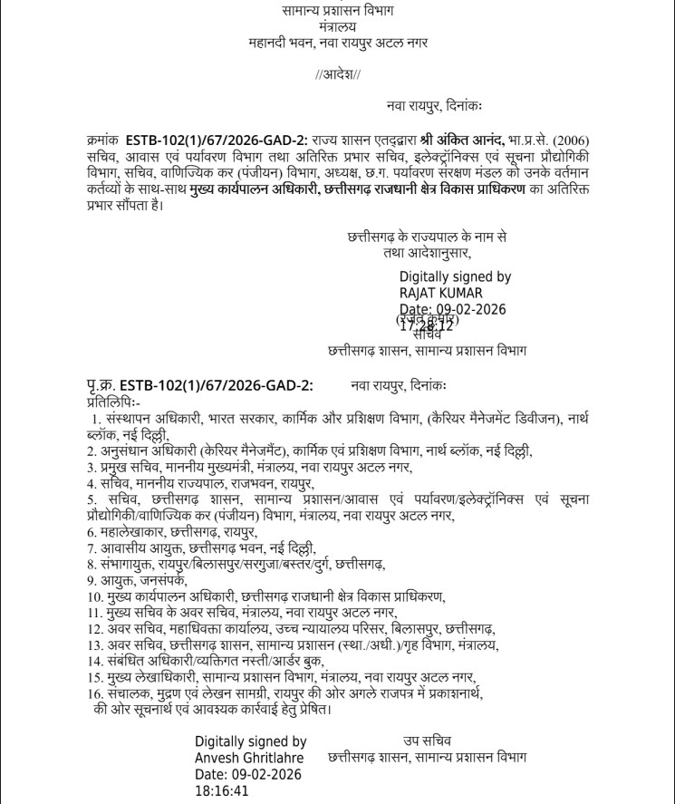 जीएडी की तरह से जारी आदेश में बताया गया है कि, “राज्य शासन एतद्द्वारा अंकित आनंद, भा.प्र.से. (2006) सचिव, आवास एवं पर्यावरण विभाग तथा अतिरिक्त प्रभार सचिव, इलेक्ट्रॉनिक्स एवं सूचना प्रौद्योगिकी विभाग, सचिव, वाणिज्यिक कर (पंजीयन) विभाग, अध्यक्ष, छ.ग. पर्यावरण संरक्षण मंडल को उनके वर्तमान कर्तव्यों के साथ-साथ मुख्य कार्यपालन अधिकारी, छत्तीसगढ़ राजधानी क्षेत्र विकास प्राधिकरण का अतिरिक्त प्रभार सौंपता है।”