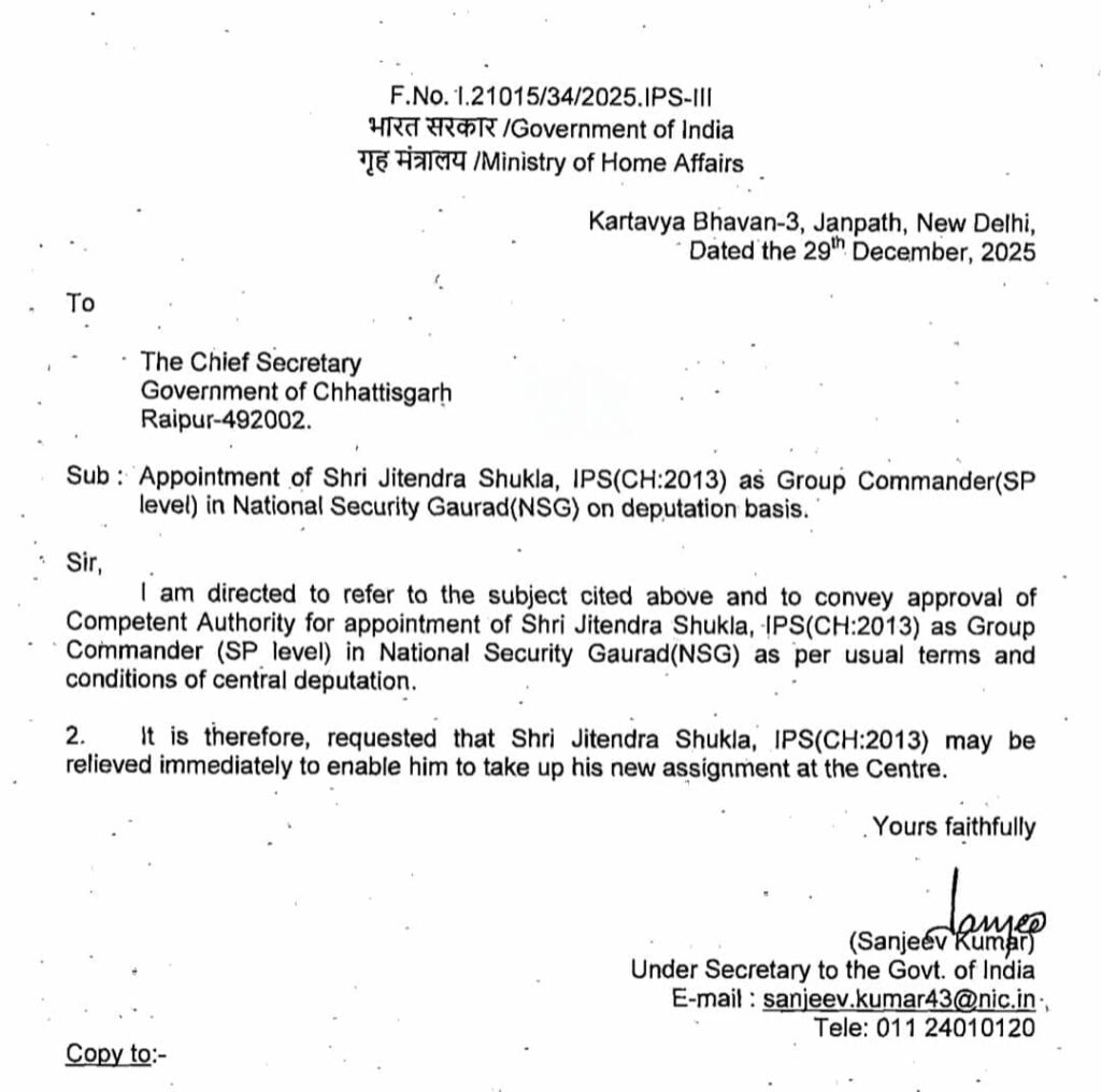 ताजा आदेश जगदलपुर बटालियन के कमांडेंट और तेजतर्रार आईपीएस जितेंद्र शुक्ला को लेकर जारी हुआ है। आईपीएस जितेंद्र शुक्ला प्रतिनियुक्ति पर दिल्ली जा रहे है। वे एनएसजी यानी नेशनल सिक्योरिटी गार्ड में एसपी का पद संभालेंगे। इस संबंध में डेपुटेशन आर्डर जारी हो गया है।
