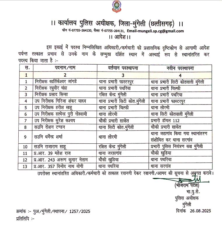 - मुंगेली में 13 पुलिसकर्मियों का तबादला आदेश जारी।
