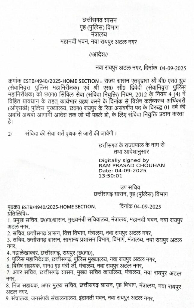 Retired IPS Contractual Appointment: : नियुक्त होने वाले अफसरों में बीएस ध्रुव (पुलिस महानिरीक्षक) और एससी द्विवेदी (पुलिस महानिरीक्षक) का नाम शामिल है। फिलहाल दोनों ही अफसरों को पुलिस मुख्यालय नया रायपुर में विशेष कर्त्तव्यस्थ अधिकारी (OSD) के तौर पर तैनाती मिली है। इस संबंध में गृह विभाग की तरफ से विधिवत आदेश जारी कर दिया गया है। आदेश में बताया गया है कि, यह नियुक्ति एक वर्ष के लिए होगी जबकि संविदा के सेवा शर्तें पृथक से जारी की जाएगी।