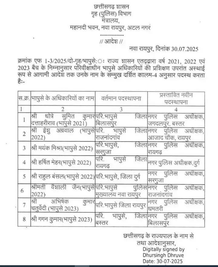 CG IPS Transfer and Posting News: रायपुर: छत्तीसगढ़ के गृह विभाग ने राज्य के 8 ट्रेनी आईपीएस अफसरों को परीक्षण पश्चात नई जगहों पर पदस्थापना दी है। इस संबंध में सरकार की तरफ से औपचारिक आदेश और सूची जारी कर दिया गया है। सूची में 2021, 2022 और 2023 बैच के अफसरों का नाम शामिल है। सभी को अलग-अलग जिलों में बतौर नगर पुलिस अधीक्षक पदस्थ किया गया है।