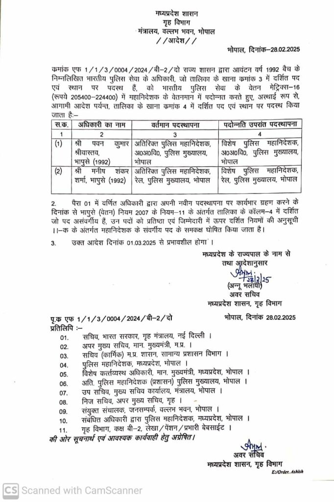 IAS-IPS Promioton & Posting Madhya Pradesh: इसी तरह 1992 बैच के दो भारतीय पुलिस सेवा के अधिकारी पवन श्रीवास्तव और मनीष शंकर शर्मा प्रमोट होकर पुलिस विभाग में विशेष महानिदेशक बनाये गए है। देखें आदेश..