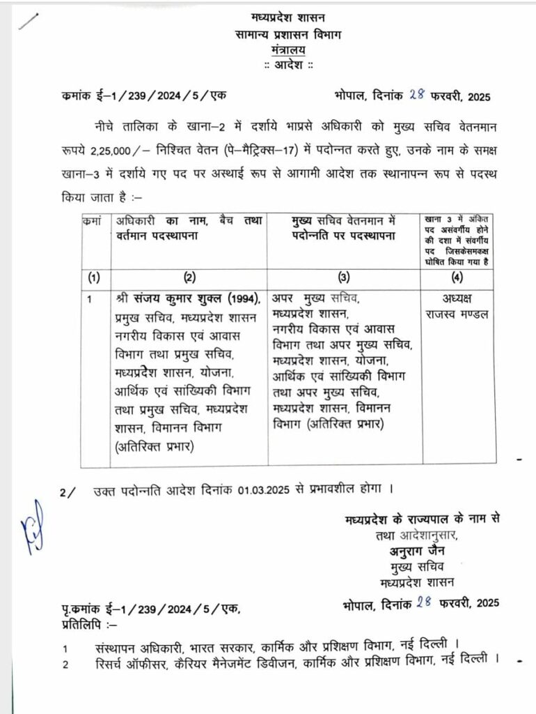 - मध्यप्रदेश में आईएएस संजय शुक्ला बने अपर मुख्य सचिव, पदोन्नति आदेश जारी