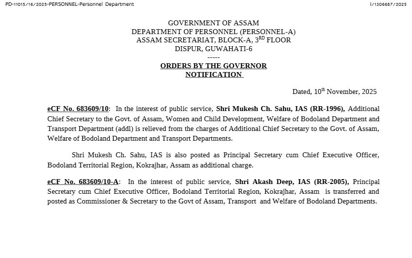 दरअसल आईएएस अधिकारी मुकेश चौधरी साहू, अतिरिक्त मुख्य सचिव, महिला एवं बाल विकास बोडोलैंड कल्याण विभाग और परिवहन विभाग को बोडोलैंड कल्याण विभाग और परिवहन विभागों के अतिरिक्त मुख्य सचिव के प्रभार से मुक्त किया गया है। इसके अलावा अब उन्हें बोडोलैंड प्रादेशिक क्षेत्र कोकराझार के प्रधान सचिव सह मुख्य कार्यकारी अधिकारी के पद पर अतिरिक्त प्रभार के रूप में नियुक्त किया गया है।
