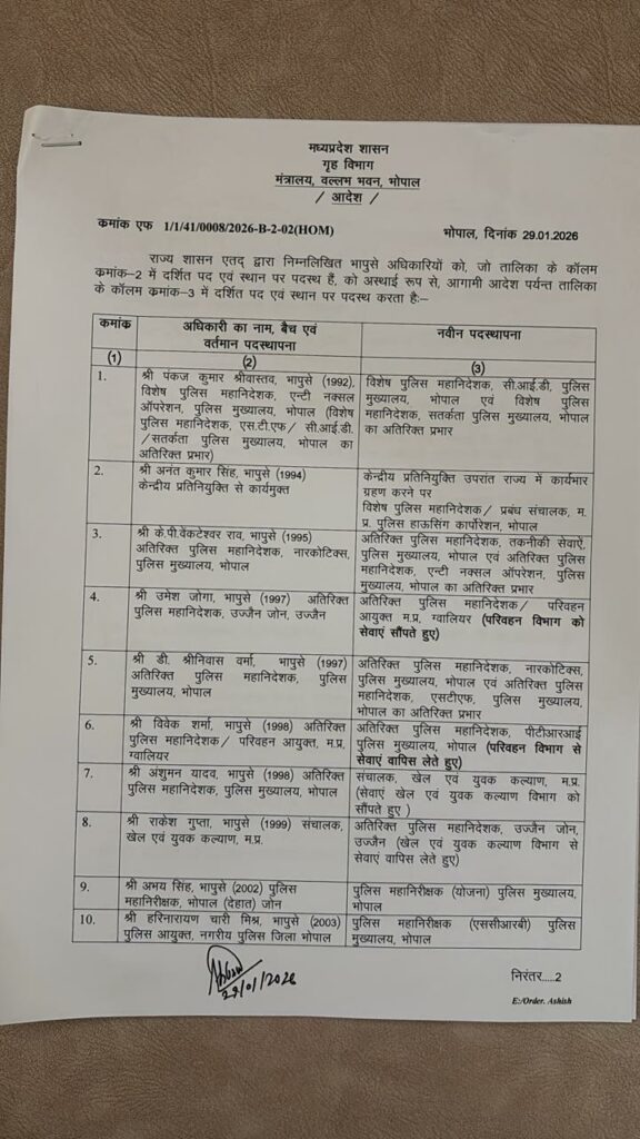 | 2 | श्री अनंत कुमार सिंह, भापुसे (1994), केंद्रीय प्रतिनियुक्ति से कार्यमुक्त | केंद्रीय प्रतिनियुक्ति उपरांत राज्य में कार्यभार ग्रहण करने पर अतिरिक्त पुलिस महानिदेशक / संयुक्त संचालक, म.प्र. पुलिस हाउसिंग कॉर्पोरेशन, भोपाल |