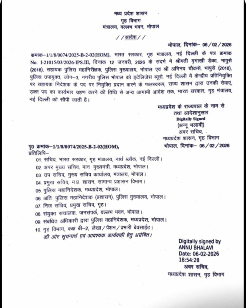 जिन दो आईपीएस अफसरों को केंद्रीय प्रतिनयुक्ति मिली है, उनमें 2018 बैच के मृगांकी डेका और अभिनव चौक का नाम शामिल है। (Madhya Pradesh IPS Central Deputation Order) अभिनव राजधानी भोपाल के जोन-3 में पुलिस उपयुक्त के तौर पर सेवारत थे जबकि मृगांकी डेका के पास सहायक पुलिस निरीक्षक के रूप में पुलिस महानिदेशालय में तैनात थी।