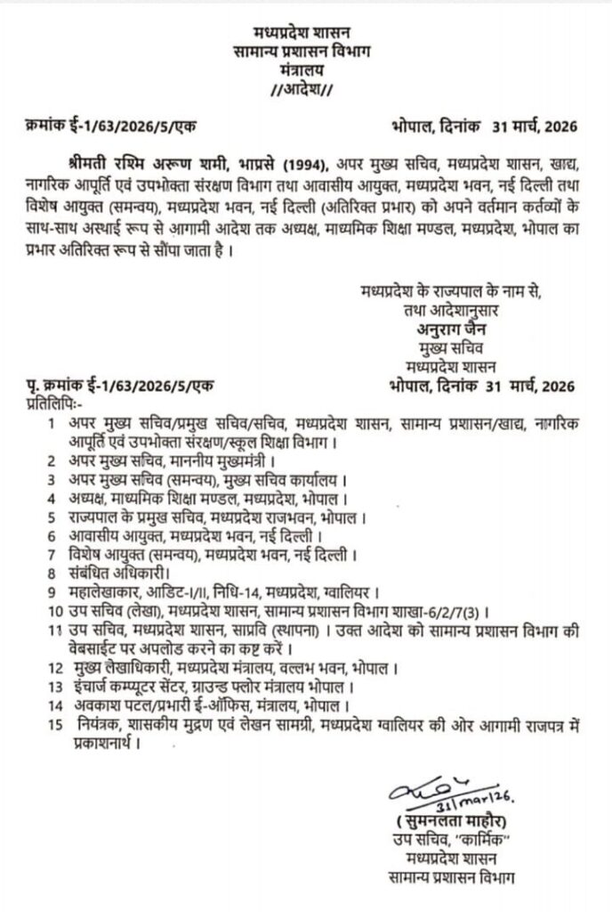 MP Madhyamik Shiksha Mandal News: आईएएस रश्मि अरुण शमी को मध्यप्रदेश माध्यमिक शिक्षा मंडल अध्यक्ष का अतिरिक्त प्रभार, स्मिता भारद्वाज के रिटायरमेंट के बाद नियुक्ति।