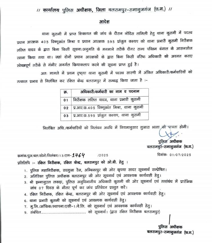 - कुसमी थाना प्रभारी और दो आरक्षक सस्पेंड किए गए।