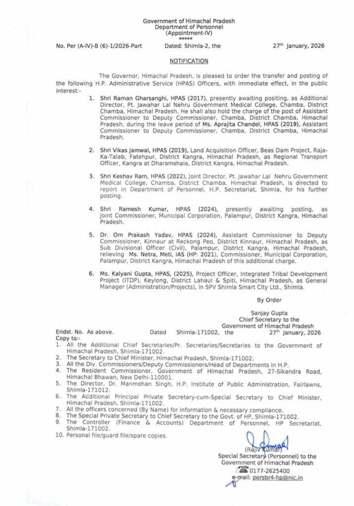 इसके अलावा प्रोजेक्ट ऑफिसर, इंटीग्रेटेड ट्राइबल डेवलपमेंट प्रोजेक्ट (ITDP), केलांग, जिला लाहौल स्पीति, कल्याणी गुप्ता को जनरल मैनेजर (प्रशासन/प्रोजेक्ट), SPV शिमला स्मार्ट सिटी लिमिटेड शिमला का नया जिम्मा सौंपा गया है।