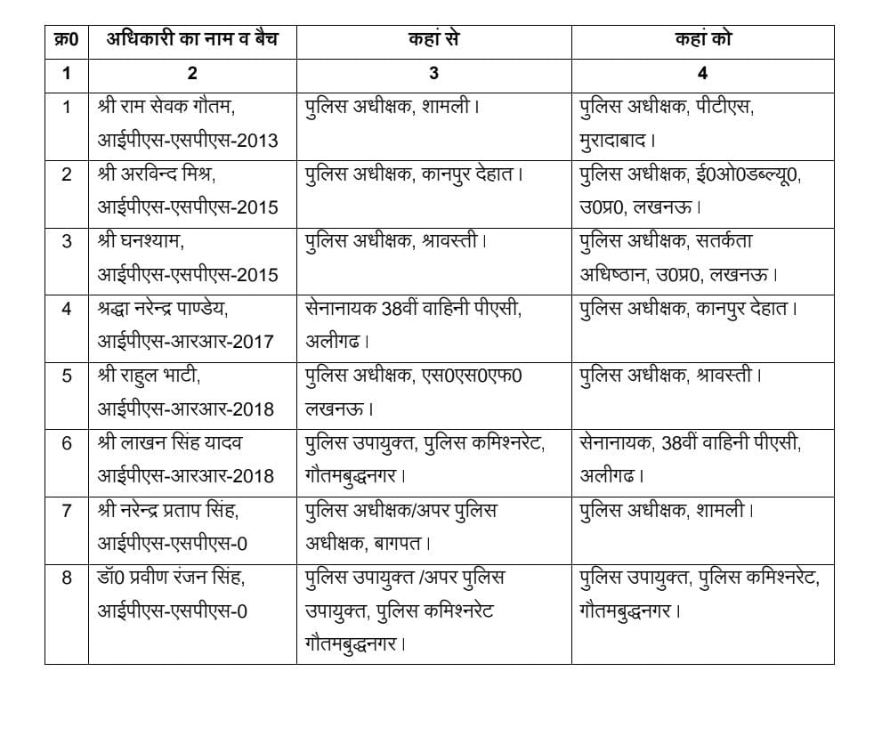UP IPS Transfer: यूपी में एक बार फिर प्रशासनिक फेरबदल किया गया है, इनमें 8 IPS अधिकारियों को इधर से उधर किया गया है। जारी सूची के अनुसार शामली पुलिस अधीक्षक रामसेवक गौतम को मुरादाबाद पीटीएस पुलिस अधीक्षक बनाया गया है। पूरी सूची आप नीचे देख सकते हैं।