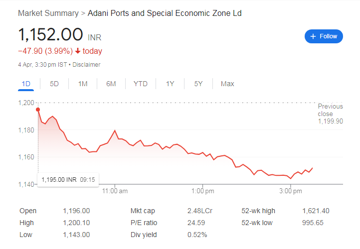 - अदानी पोर्ट्स के शेयर में 3.99% की गिरावट, 1152 रुपये पर बंद हुआ।