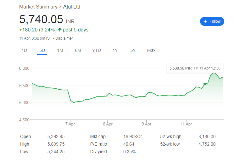 अतुल लिमिटेड के शेयरों का 52 सप्ताह का उच्चतम स्तर 8,180 रुपये और न्यूनतम स्तर 4,752 रुपये रहा है। पिछले 6 महीनों में शेयर मूल्य में लगभग 25% की गिरावट आई है और इस वर्ष अब तक लगभग 15% की गिरावट देखी गई है।