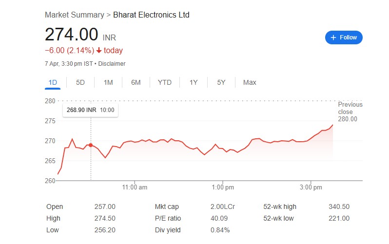 BEL Share Price: सोमवार, 7 अप्रैल 2025 को शेयर बाजार की शुरुआत गिरावट के साथ हुई। बाजार की इस कमजोरी का असर भारत इलेक्ट्रॉनिक्स लिमिटेड (BEL) के शेयरों पर भी पड़ा। करीब 3:30 बजे BEL के शेयर में 2.14% की गिरावट देखी गई और यह 274 रुपये पर ट्रेड कर रहा था। हालांकि यह गिरावट मामूली रही, लेकिन बाजार की स्थिति को देखते हुए निवेशकों ने सतर्क रुख अपनाया है।