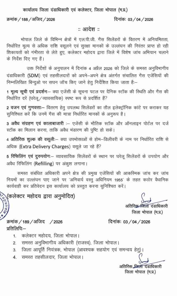 भोपाल जिले के विभिन्न क्षेत्रों में एल.पी.जी. गैस सिलेंडरों के वितरण में अनियमितता, निर्धारित मूल्य से अधिक राशि वसूली एवं सुरक्षा मानकों के उल्लंघन की गंभीर शिकायतों को लेते हुए, कलेक्टर महोदय द्वारा जिले में विशेष जांच अभियान चलाने के निर्देश दिए गए हैं।