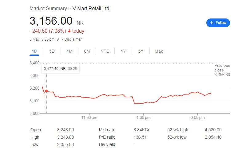 बोनस शेयर की घोषणा के बाद भी वी-मार्ट के शेयरों में बड़ी गिरावट आई। 5 मई को शेयर 7.08% टूटकर 3,156 रुपये पर बंद हुआ। शुरुआती ट्रेडिंग में शेयर में मुनाफा वसूली देखी गई थी, लेकिन अंत में दबाव हावी रहा। बावजूद इसके, बोनस शेयरों के चलते निवेशकों की इसमें रुचि बरकरार रह सकती है।
