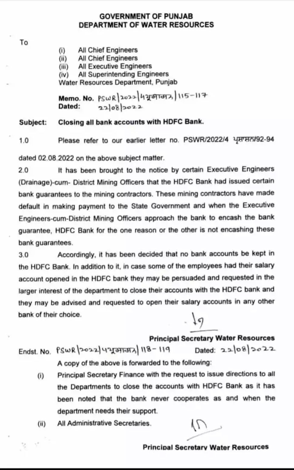 नई दिल्ली। Close your HDFC accounts : HDFC बैंक के खाताधारकों को लेकर एक बड़ा अपडेट सामने आया है। अगर आपका भी खाता एचडीएफसी बैंक में है तो जानकर आपको भी झटका लग सकता हैं, लेकिन यह सरकारी आदेश सिर्फ सरकारी कर्मचारियों के लिए है। पंजाब सरकार ने अपने सरकारी कर्मचारियों को HDFC बैंक में खाता नहीं खुलवाने की सलाह दी है। राज्य सरकार ने आखिर यह कदम क्यों उठाया चलिए आपको बताते हैं। >>*IBC24 News Channel के WHATSAPP ग्रुप से जुड़ने के लिए यहां CLICK करें*<<