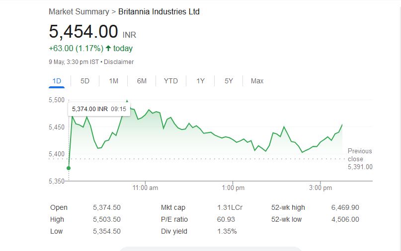 शुक्रवार 9 मई 2025 को ब्रिटानिया के शेयरों में 1.17% की तेजी देखने को मिली और यह 5454 रुपये पर बंद हुआ। साल 2025 में अब तक कंपनी के शेयरों में 13% से अधिक की बढ़त देखी गई है। पिछले एक साल में इसमें 7% से अधिक की तेजी आई है, जबकि इस दौरान सेंसेक्स में करीब 9.74% की तेजी आई है।