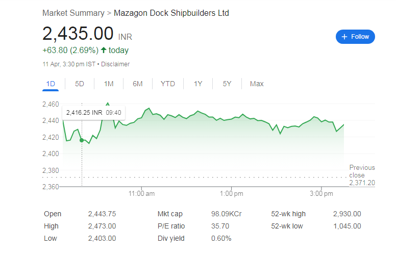 शुक्रवार, 11 अप्रैल 2025 को माझगांव डॉक का शेयर 2.69% की तेजी के साथ 2,435.00 रुपये पर बंद हुआ। इस साल 2025 की शुरुआत से अब तक कंपनी के शेयर ने 5.49% का रिटर्न दिया है। डिविडेंड की घोषणा के बाद शेयर में और भी तेजी आने की संभावना है क्योंकि इससे निवेशकों का कंपनी के प्रति भरोसा बढ़ता है।