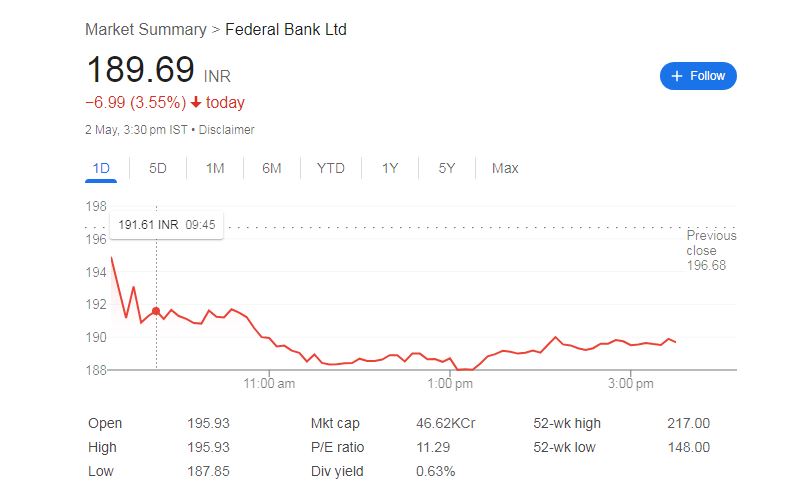 - फेडरल बैंक का शेयर 3.55% टूटा, भाव गिरकर 189.69 रुपये पर आया।