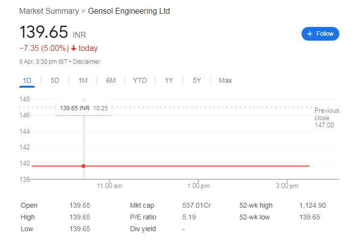 Gensol Engineering Share Price: जेनसोल इंजीनियरिंग के शेयरों में लगातार दूसरे दिन भारी बिक्री का दबाव देखने को मिला। 8 अप्रैल 2025 को इस शेयर पर लोअर सर्किट लग गया, जिससे निवेशकों को बड़ा नुकसान हुआ। केवल 14 महीनों में निवेशकों की पूंजी 89% तक घट गई है। शेयर की कीमत 1377 रुपये के उच्चतम स्तर से गिरकर अब 147 रुपये तक पहुंच गई है।
