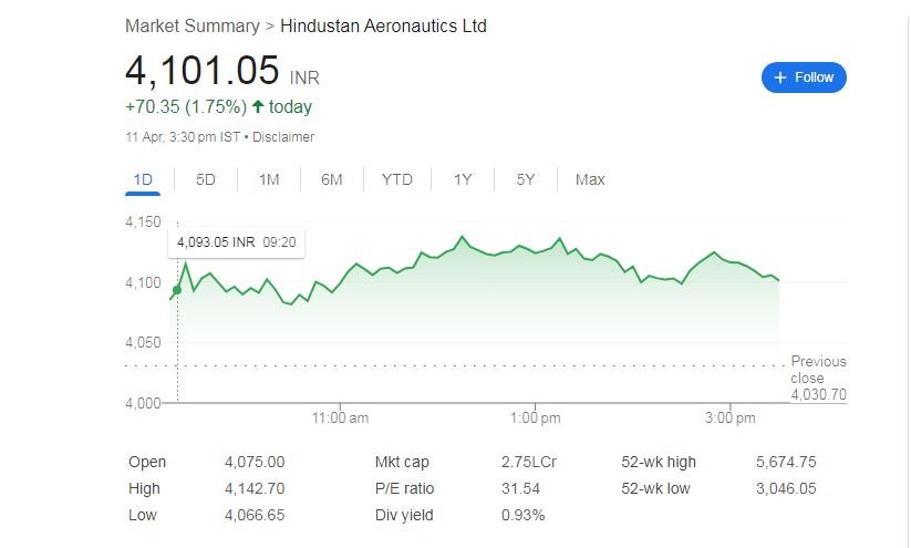 HAL Share Price: शुक्रवार, 11 अप्रैल 2025 को हिन्दुस्तान एयरोनॉटिक्स लिमिटेड (HAL) के शेयर में अच्छी बढ़त दर्ज की गई। शेयर 1.75% की तेजी के साथ 4101.05 रुपये पर बंद हुआ। ट्रेडिंग की शुरुआत 4075 रुपये पर हुई और दिन के दौरान यह 4142.70 रुपये के हाई तक पहुंचा। वहीं, लो लेवल 4066.65 रुपये रहा।