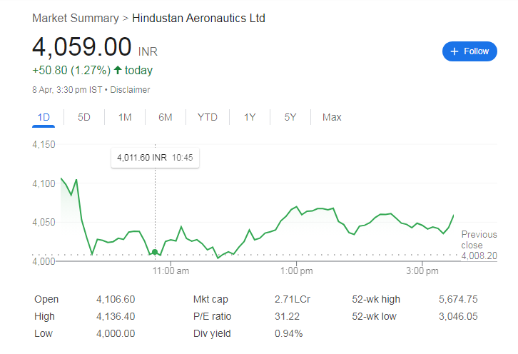 - HAL के शेयर में 1.27% की तेजी, 4,059 रुपये पर बंद।